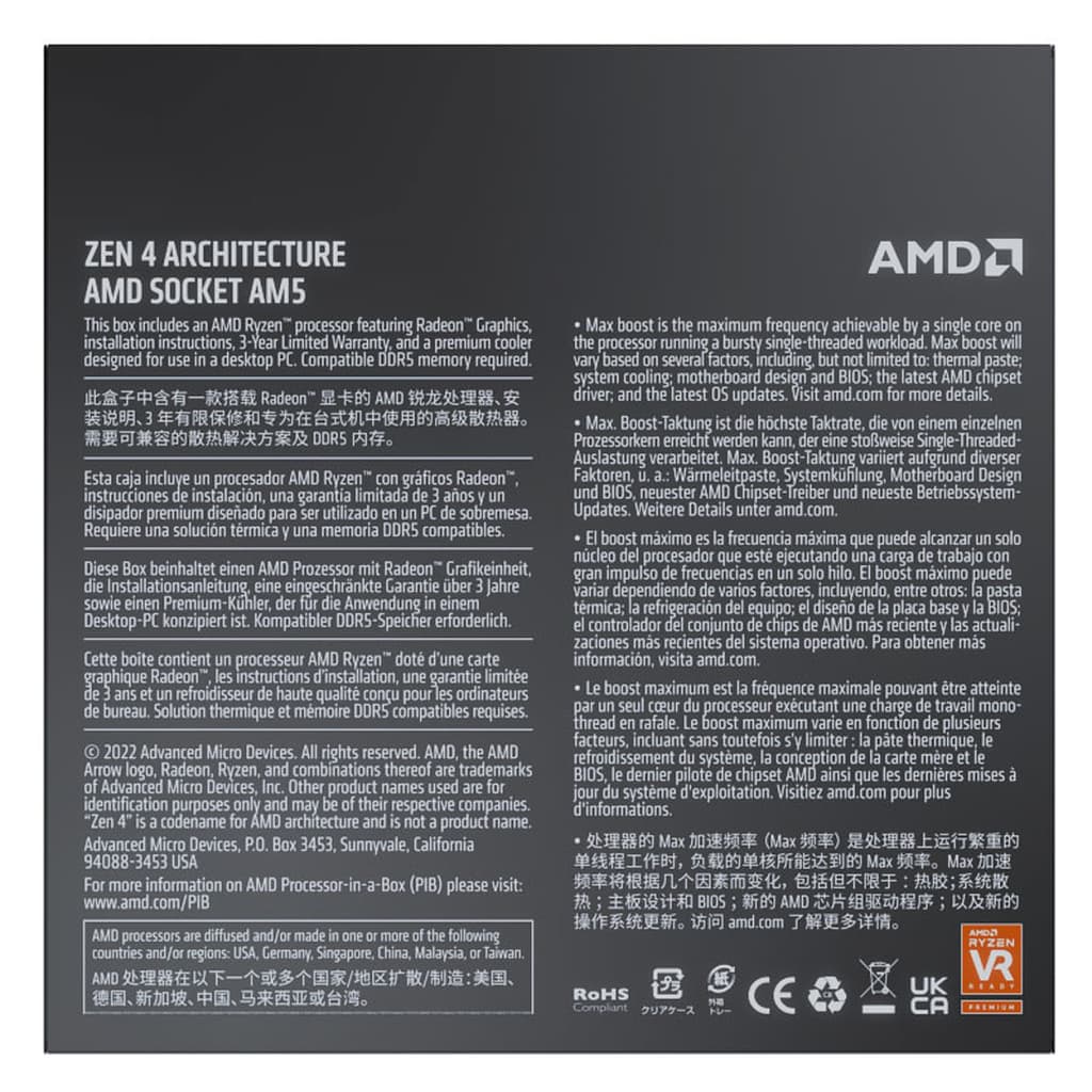 AM5, 8 ядер, 16 потоків, 3.8 GHz, 5.3 GHz, Максимальний TDP - 65 Вт, 5nm, L1: 512KB, L2: 8MB, L3: 32MB, AMD Radeon Graphics, AMD Zen 4, BOX