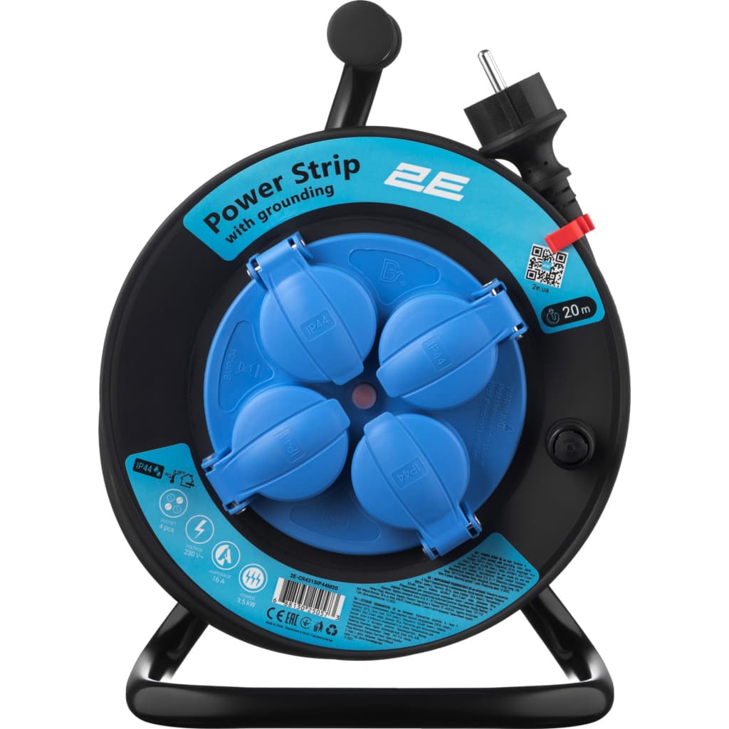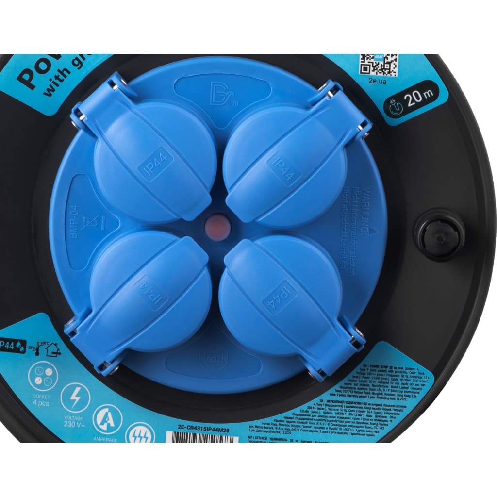Кількість розеток - 4, євророзетка із заземленням (Тип F), Довжина кабелю - 20 м, заземлюючий контакт, на кабельній котушці, Захист - IP44, Сумарна потужність підключеного навантаження - < 3500 Вт, Колір - синьо-чорний