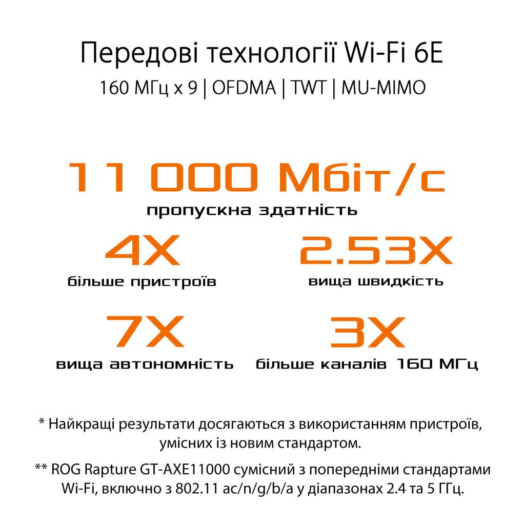 n, ac, a, g, b, ax, 4804 Мбіт/с, 2.4/5/6 ГГц, незнімні, Антен - 8, WPA, WPA2, WPS, МАС-фільтр, WPA3, 10/100/1000BASE-T Ethernet, 10/100/1000/2500 BASE-T Ethernet, LAN - 4, 2 х USB 3.2, SPI, демілітаризована зона (DMZ), захист від DDoS-атак, Beamforming, VPN - так, 1 шт