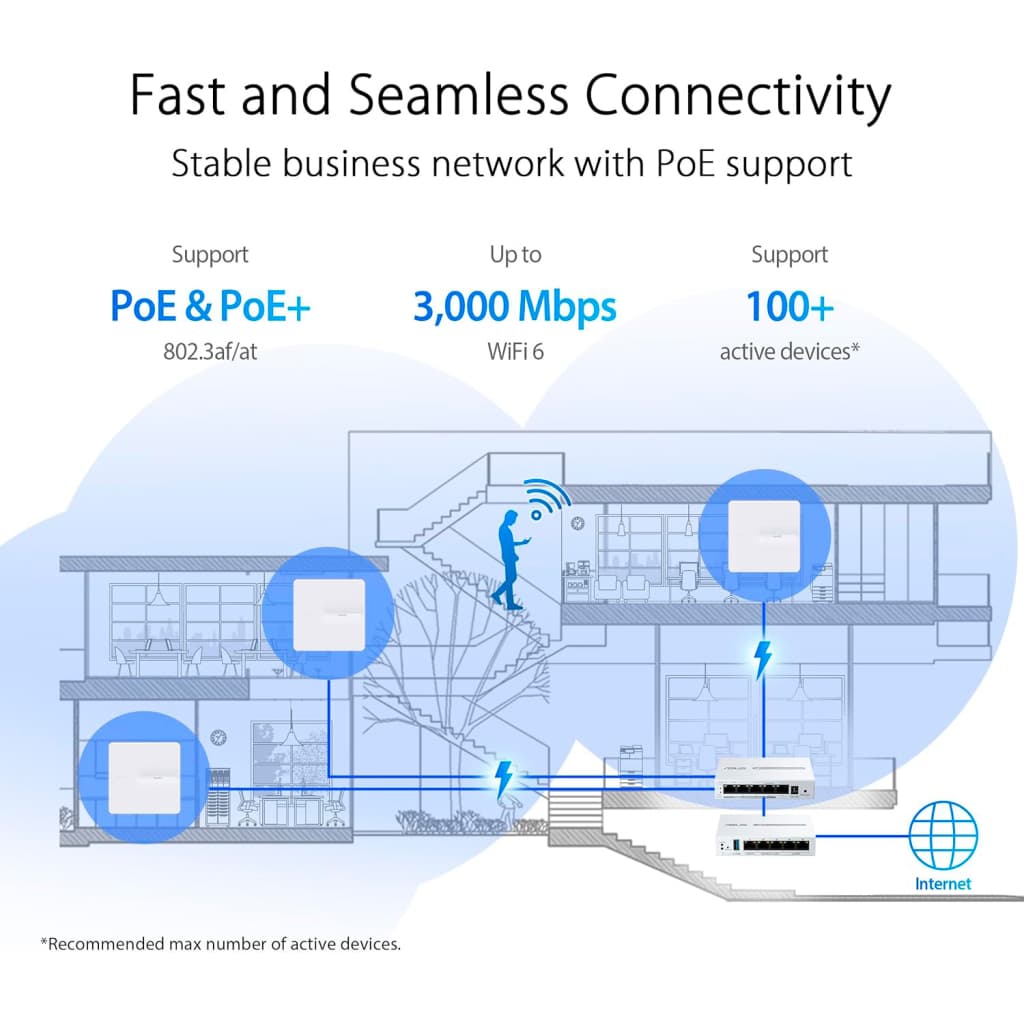 Режими роботи - Wi-Fi точка, стандарти мереж - a (до 54 Мбіт/с), b (до 11 Мбіт/с), g (до 54 Мбіт/с), n (до 300 Мбіт/с), ac (до 1.73 Гбіт/с), ax (до 2402 Мбіт/с), робоча частота - 2.4 / 5 ГГц, тип антени - вбудована/незнімна, інтерфейси - 10/100/1000BASE-T