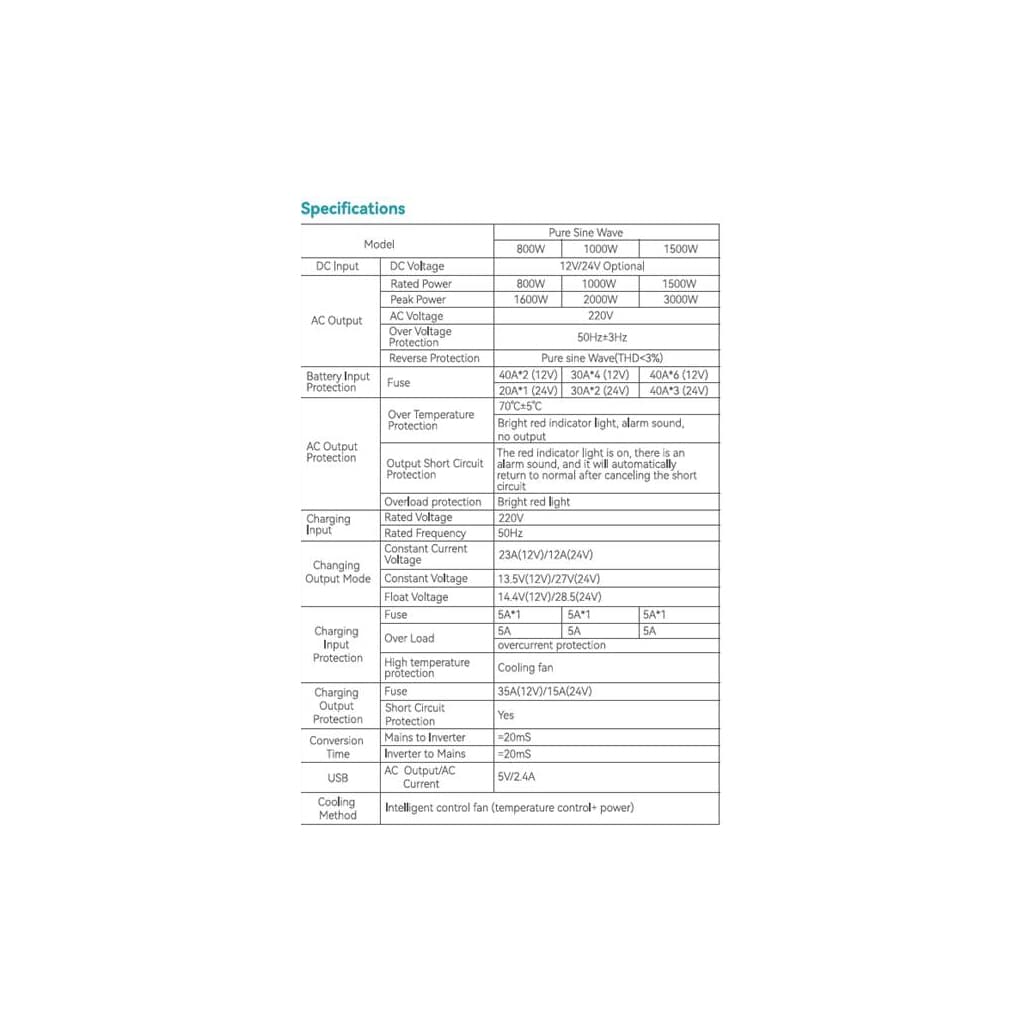 Вхідна напруга - 12 В, Вихідна потужність - 1000 Вт, Вихідна напруга - 220 В, Спосіб підключення - зажими, Синусоіда - чиста, Захист - від перевантаження, від високої напруги, від низької напруги, від короткого замикання, від перегріву, активне