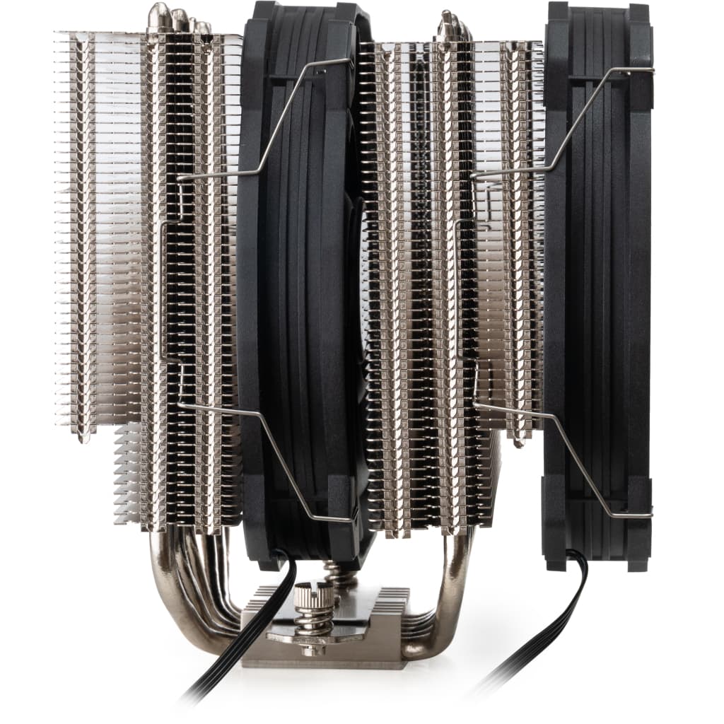 Для процесорів - INTEL, AMD, сокет - AM3, AM4, AM5, 1150, 1151, 1152, 1155, 1156, 1200, 1366, 1700, 1851, 2011, 2066, матеріал радіатора - алюміній, діаметр вентиляторів - 140 мм, Максимальна частота обертів - 1500 об/хв, Тип підшипників - гідродинамічний (FDB Bearing), рівень шуму - 38 dB, роз'єми живлення - 4-pin, Підсвічування - немає, 6 теплових труб