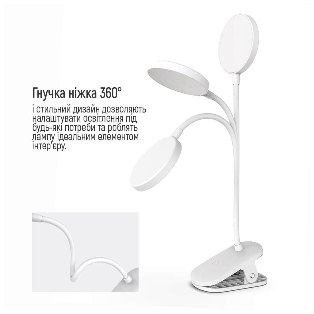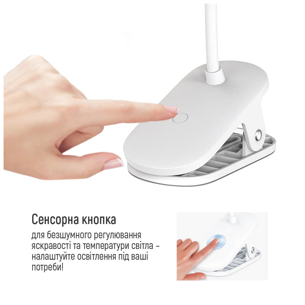 Стиль - модерн, Вид лампи - офісні, Тип лампи - LED-стрічка, Кріплення - прищіпка, незамінна, Вимикач - сенсорний, ні, так, Особливості - гнучка ніжка, Матеріал - пластик, Колір - білий