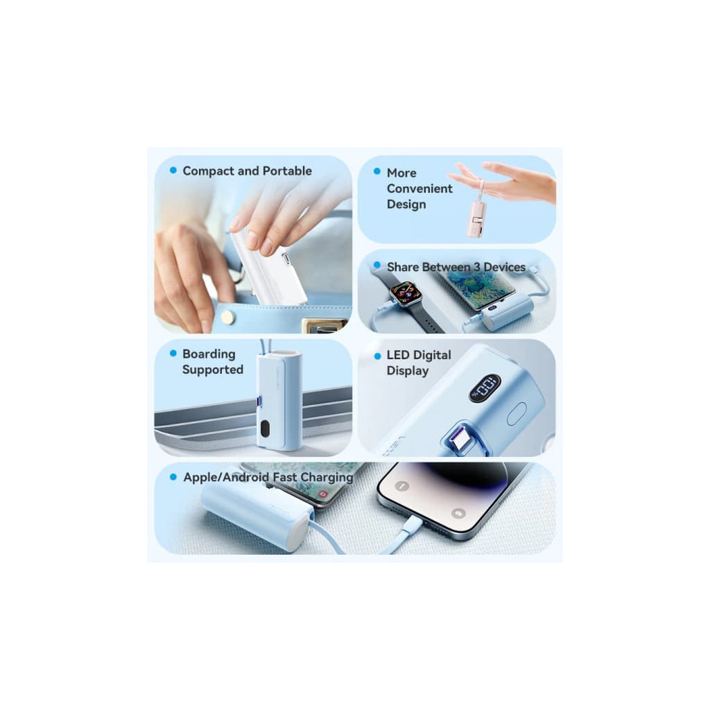 Ємність - 4800 mAh, електрохімічна система - Li-pol, Джерело заряду батареї - мережа 220 В, інтерфейси підключення (вихід) - Lightning, 2 x USB Type-C, вихідний струм - 1.5 A, 3 A, 2 A, 2.22 A, 1.67 A, розмір - 81.8 х 38.4 х 30 мм, матеріал корпусу - PC-пластик, ABS пластик, вага - 116 г, Колір - блакитний