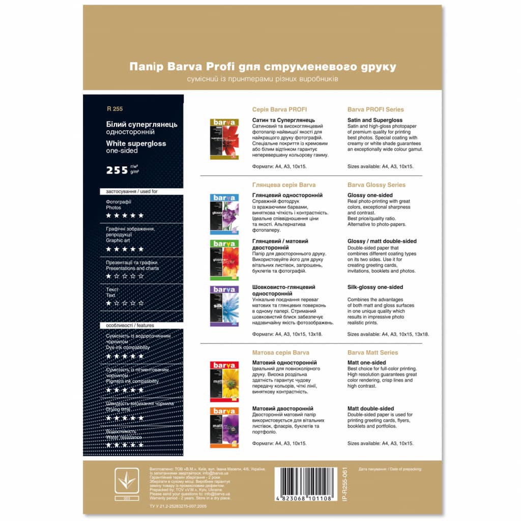 тип друку - струменевий, колір - білий, формат - А4 (297 x 210 мм), щільність - 255 г/м2, покриття - суперглянець, кількість - 20