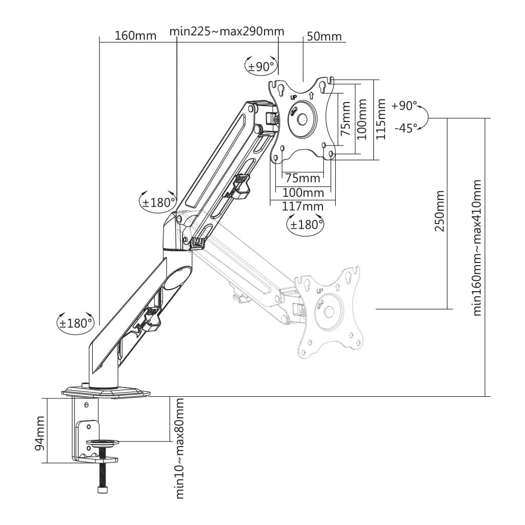 для монітора, Тип - поворотно-похилий, кількість ступенів свободи - 0, мінімальна підтримувана діагональ - 17", максимальна підтримувана діагональ - 27", VESA - 75 x 75, 100 x 100, Максимальне навантаження - 6.5 кг, Нахил - +90°~-45°, кронштейн, чорний