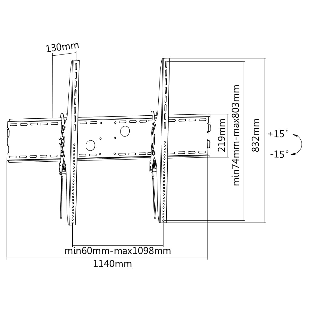 для телевізора, Тип - похилий, кількість ступенів свободи - 1, мінімальна підтримувана діагональ - 60", максимальна підтримувана діагональ - 100", VESA - 200 x 200, 200 x 300, 300 x 200, 200 x 400, 200 x 500, 300 x 300, 400 x 200, 400 x 300, 400 x 400, 400 x 600, 400 x 800, 450 x 800, 500 x 350, 500 x 400, 600 x 200, 600 x 300, 600 x 400, 600 x 500, 600 x 590, 600 x 600, 700 x 400, 700 x 450, 800 x 400, 800 x 500, 800 x 600, 800 x 800, 900 x 600, 1000 x 400, 1000 x 600, 1000 x 800, Максимальне навантаження - 100 кг, Нахил - 15° ~ -15°, відстань до стіни - 130 мм, набір для кріплення, вага - 8 кг, чорний