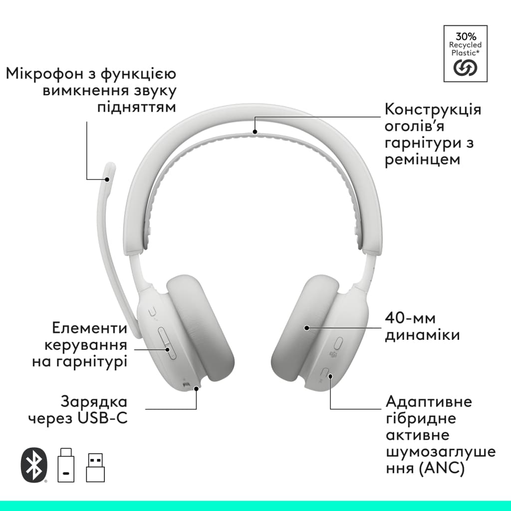 VoIP телефонія та кол-центри, комбіноване, USB Type-C, USB Type-A, Bluetooth, закриті, Випромінювач - 40 мм, 36 Ом, чутливість - 97 дБ, 20 - 20000 Гц, Активне шумозаглушення - є, з мікрофоном, Версія Bluetooth - 5.3, 48 год, White, 212 г
