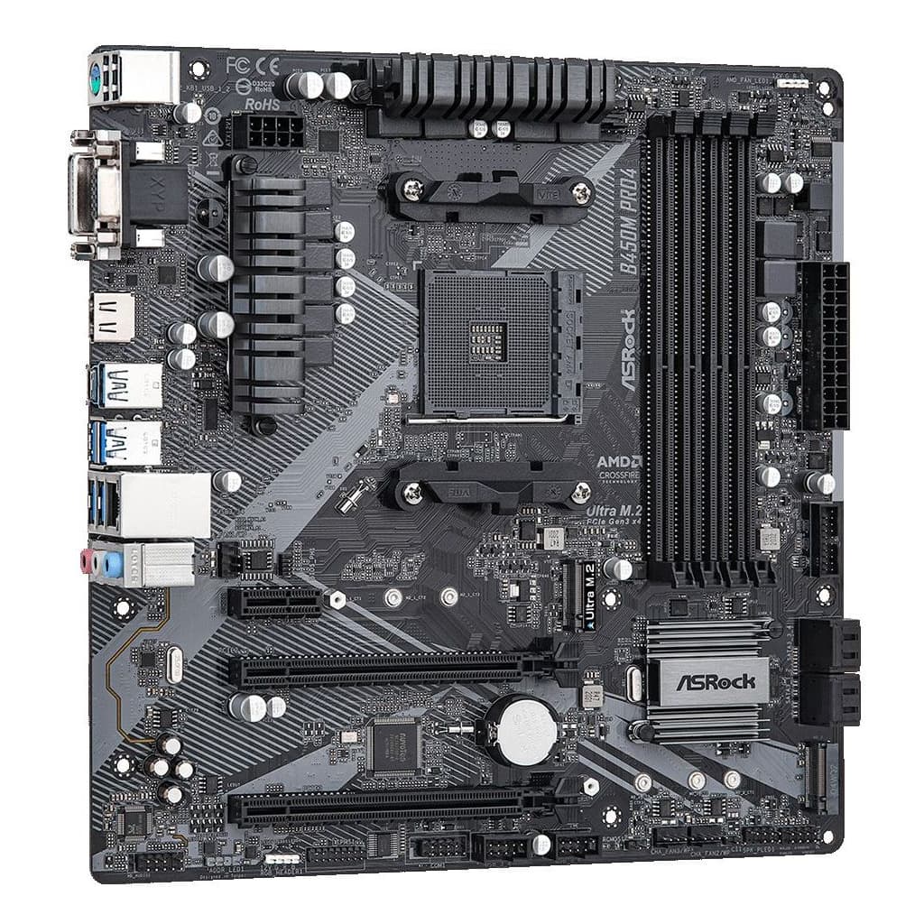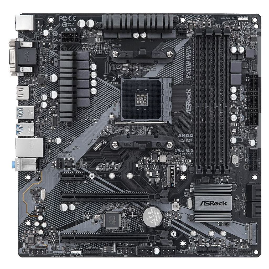сокет - AM4, чіпсет - AMD B450, DDR4, макс. об'єм оперативної пам'яті - 128 ГБ, макс. частота оперативної пам'яті - 3200 MHz, швидкість LAN - 1 Гбіт/с, D-Sub (VGA), DVI, HDMI, внутрішні - 2 x M.2 2280, 4 x Sata 6.0 Gb/s, Micro-ATX