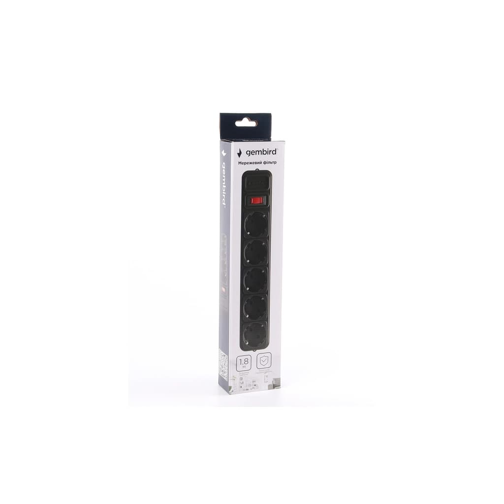 Кількість розеток - 5, Довжина кабелю - 1.8 м, заземлюючий контакт, із загальним вимикачем, Сумарна потужність підключеного навантаження - ≤ 2200 Вт, Колір - чорний