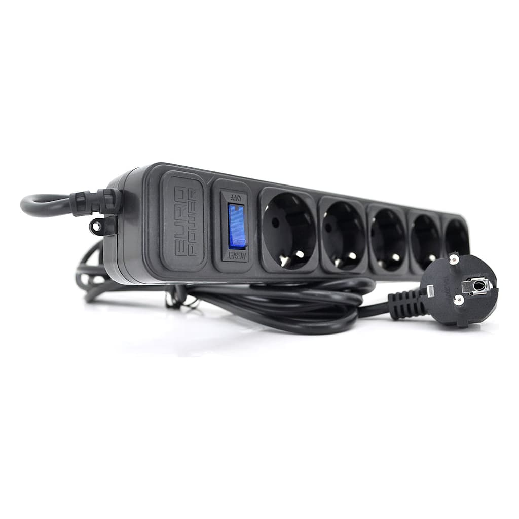Кількість розеток - 5, євророзетка із заземленням (Тип F), Довжина кабелю - 3 м, заземлюючий контакт, із загальним вимикачем, Сумарна потужність підключеного навантаження - ≤ 2000 Вт, Колір - чорний