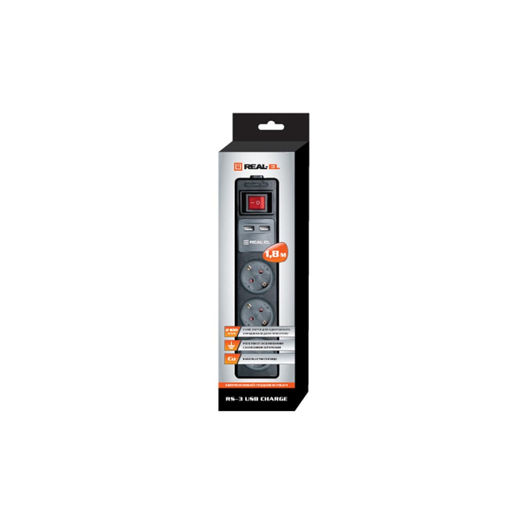 Мережевий подовжувач REAL-EL RS-3 USB CHARGE 1.8m, black (EL122500001)
