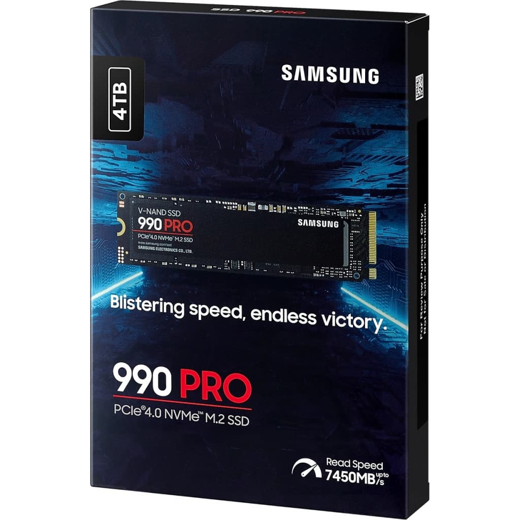 Серія - 990 Pro, 4 TB, V-NAND 3bit MLC, M.2, PCI Express 4.0 x4, Швидкість читання - 7450 Mb/s, Швидкість запису - 6900 Mb/s, 80 x 22 x 2.3 мм, 9 г, чорний