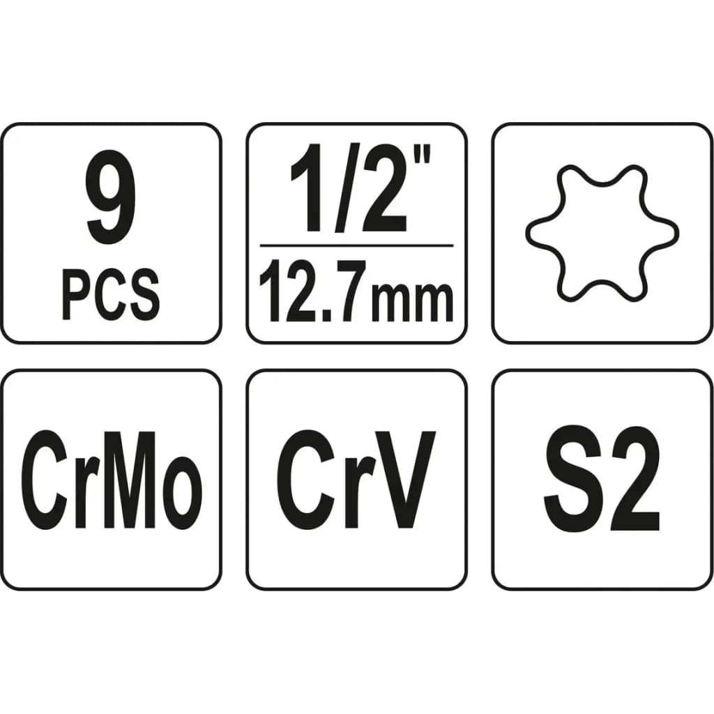 зі вставкою (битою), Кількість предметів - 9 шт, метрична, 1/2", Тип шліца вставки - зіркоподібний (Torx/T), Розмір шліца вставки - T30, T40, T45, T47, T50, T55, T60, T70