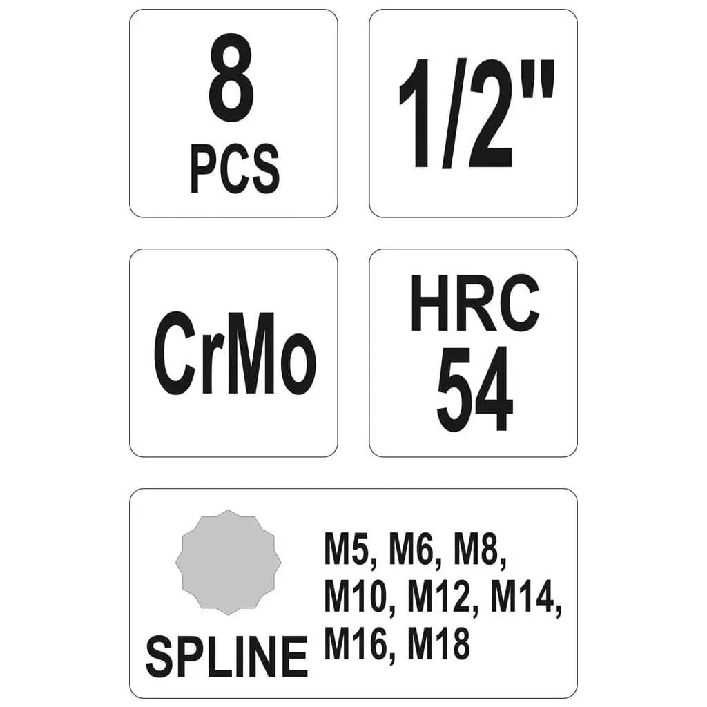 зі вставкою (битою), Кількість предметів - 8 шт, 1/2", Тип шліца вставки - дванадцятигранний (Splinе/M), Розмір шліца вставки - M5, M6, M8, M10, M12, M14, M16, M18