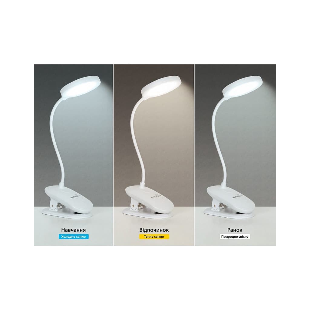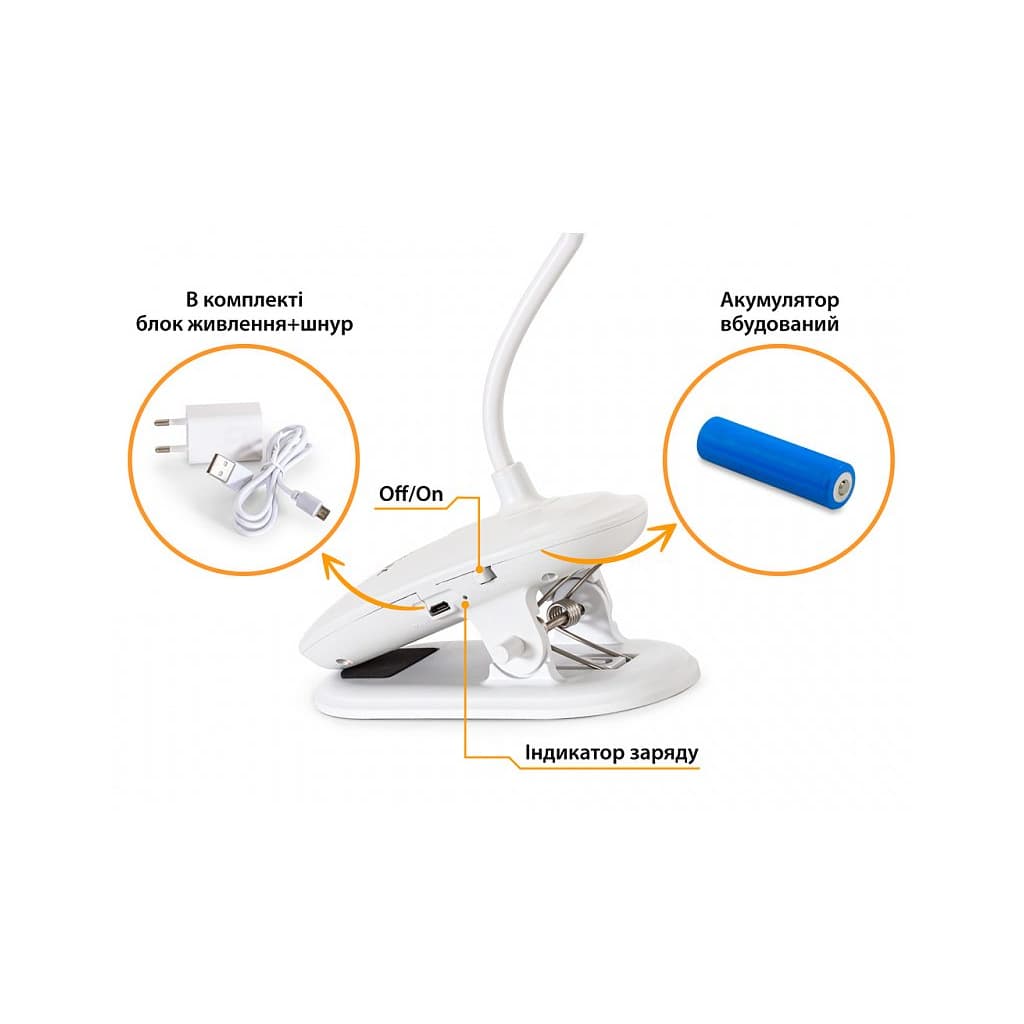 Стиль - класичні, Вид лампи - офісні, Тип лампи - LED-стрічка, Кріплення - прищіпка, незамінна, Вимикач - сенсорний, ні, так, Особливості - гнучка ніжка, Матеріал - пластик, Колір - білий
