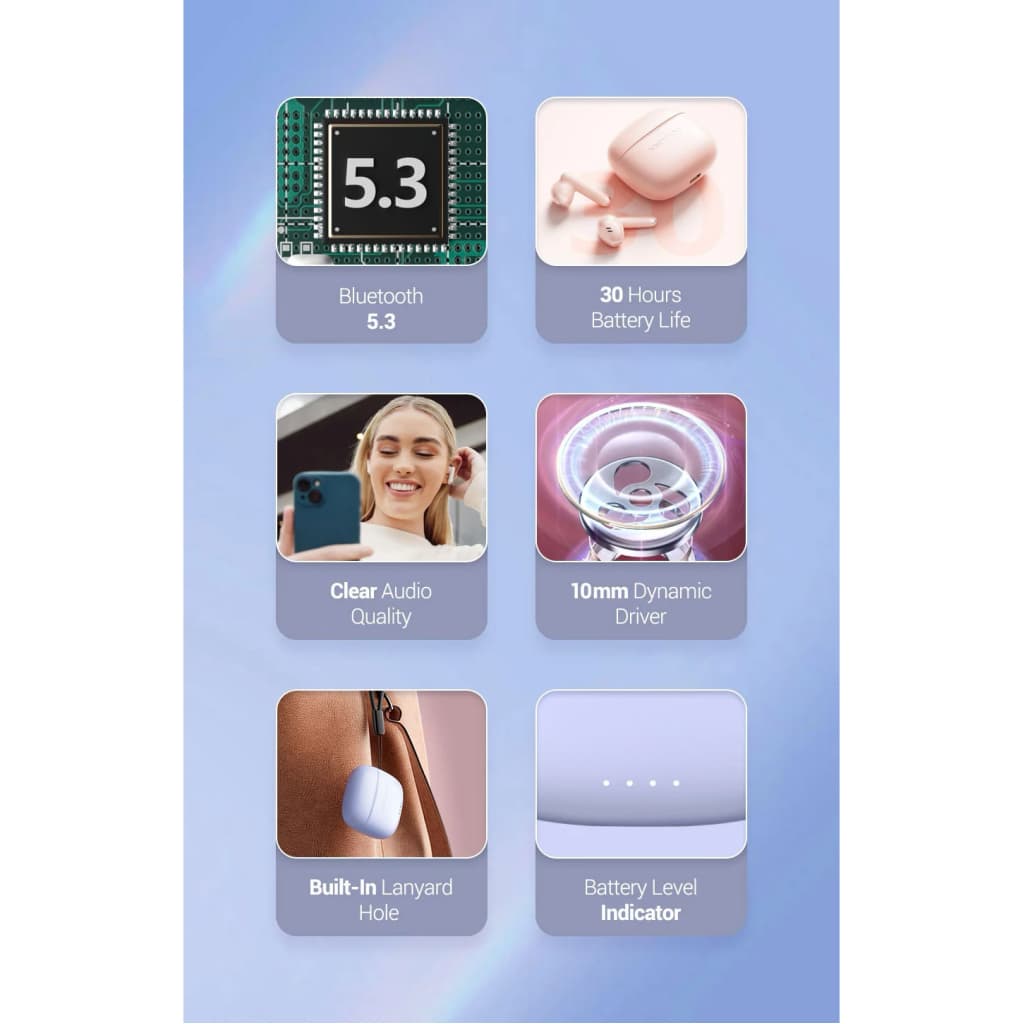 TWS (True Wireless Stereo), бездротове, Bluetooth, закриті, Випромінювач - 10 мм, 20 - 20000 Гц, тип випромінювача - динамічний, 2.0, з мікрофоном, Спрямованість мікрофона - односпрямований, Версія Bluetooth - 5.3, 6 год, Purple