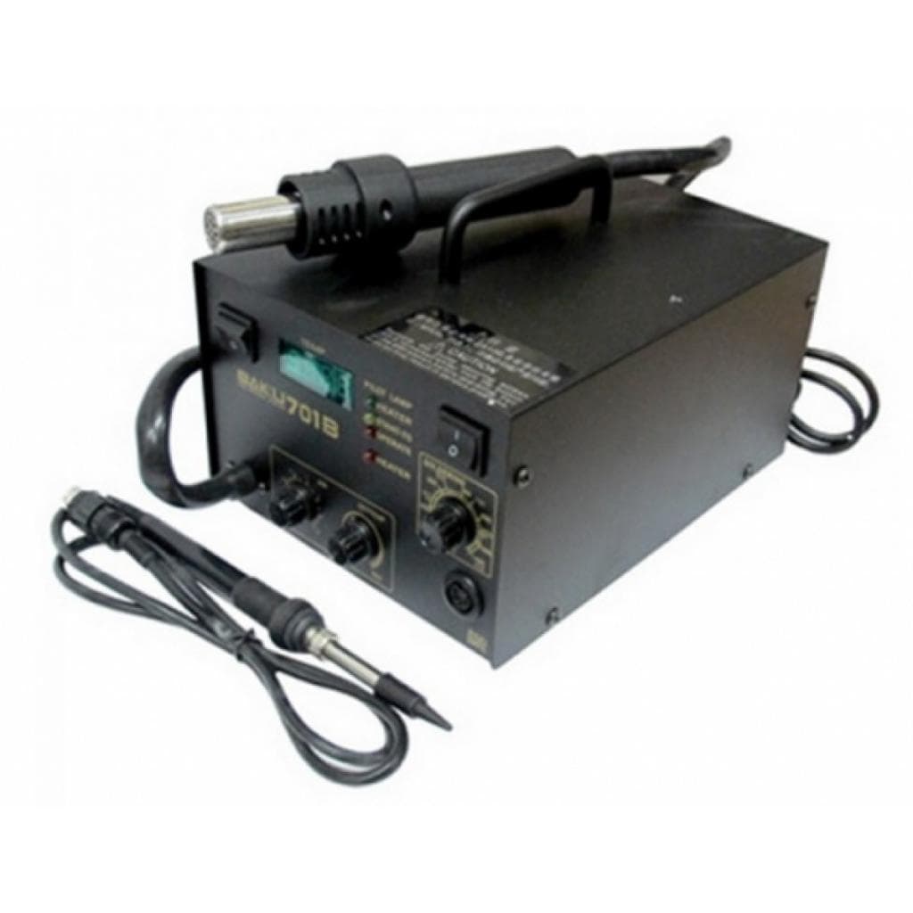 Тип - Настільний, Вид - паяльник+фен, Тип нагнітача - компресорний, Особливості - цифрова індикація, насадки для термофена, підставка для фена, губка для пайки
