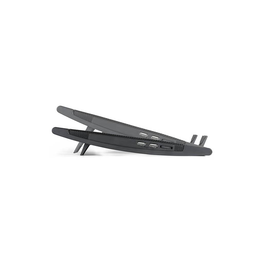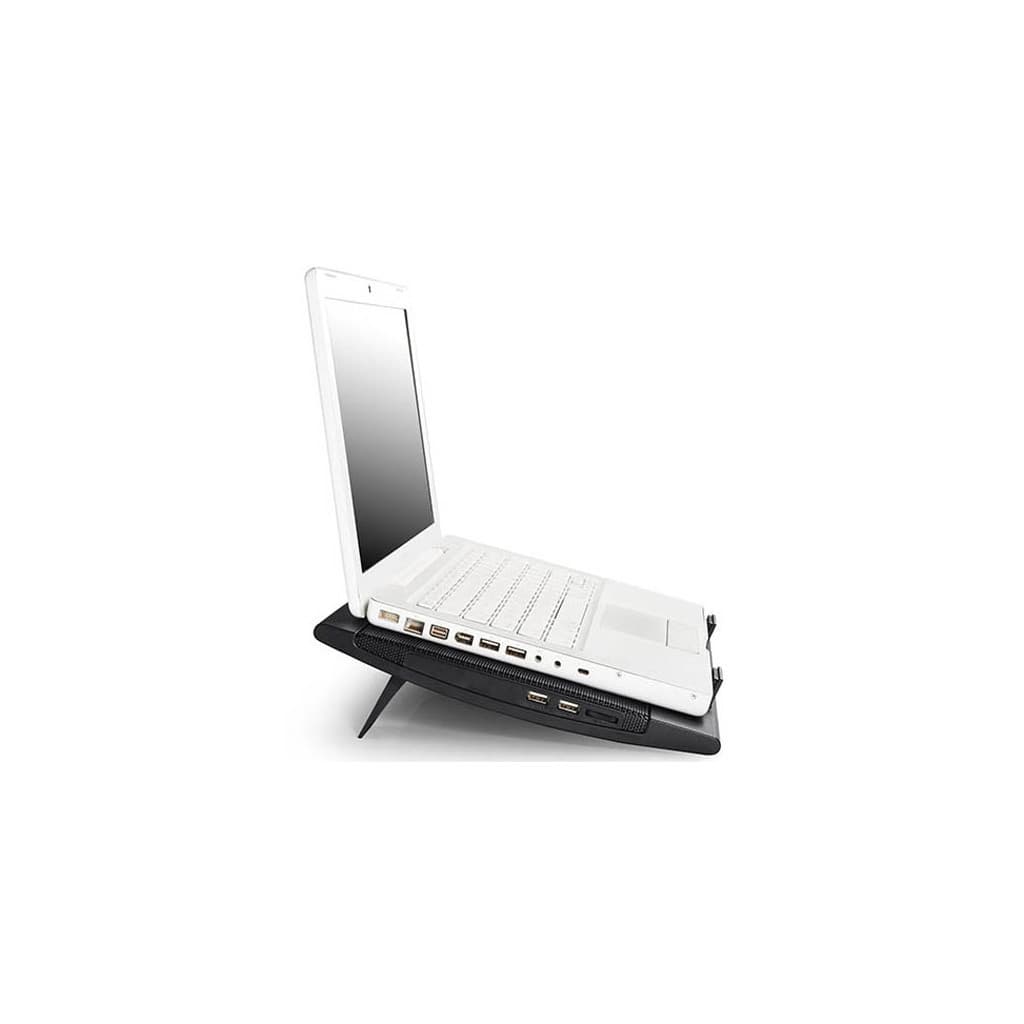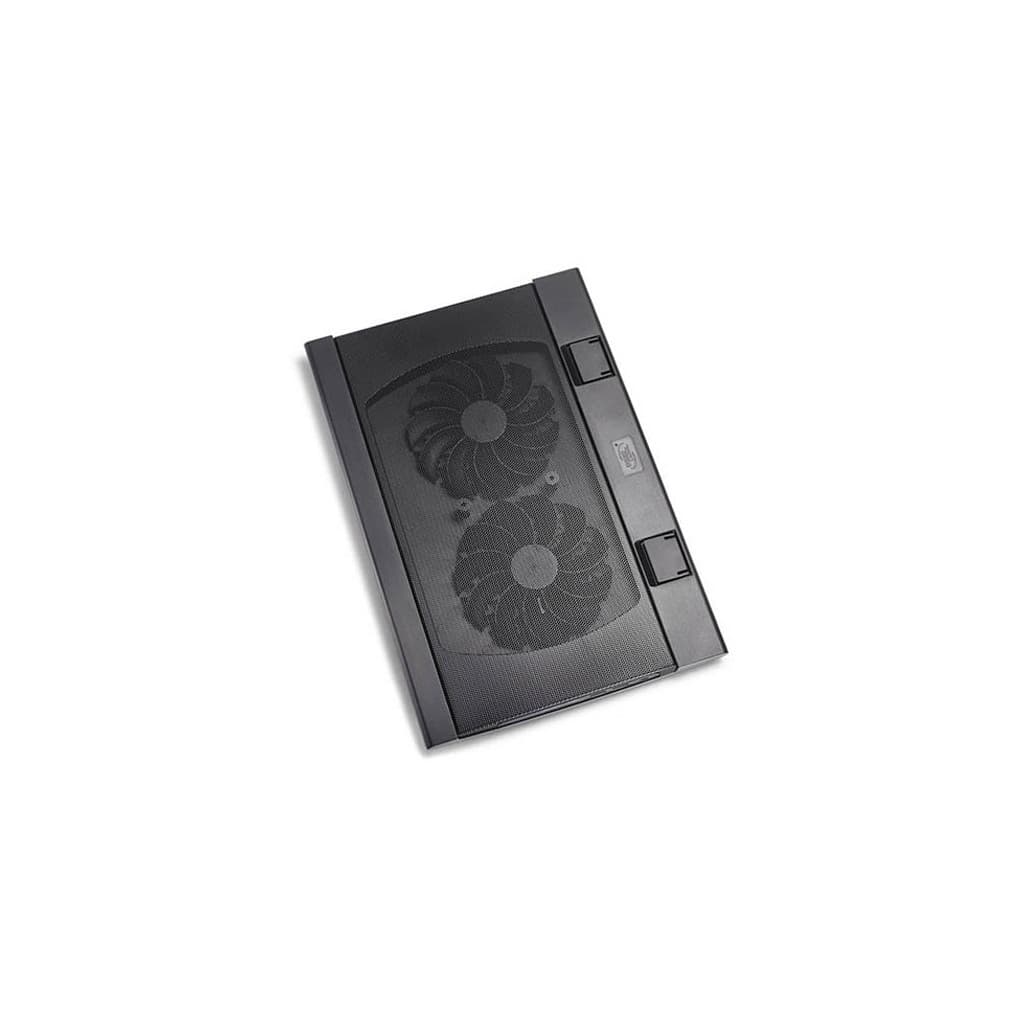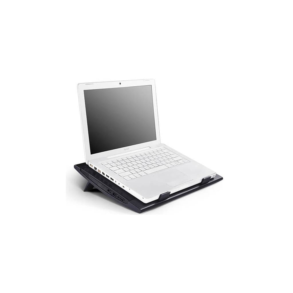 Розмір - 382 x 262 x 24 мм, Сумісність - для ноутбуків з діагоналлю екрану до 15.6", Метод охолоджування - 2 вентилятора по 140 мм, 21,5-26,5дБ, 700-1200 RPM, метал + пластик, 0.8 кг, Колір - чорний
