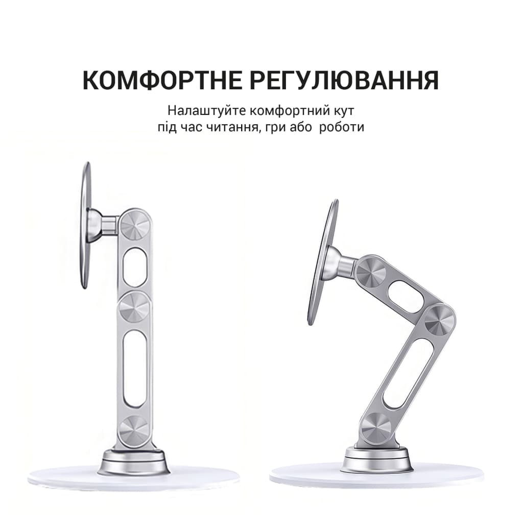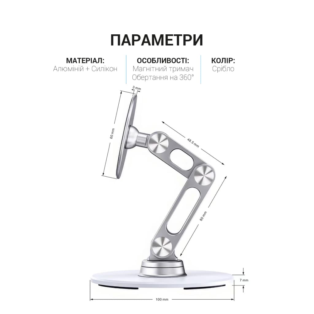 Колір - сріблястий, Сумісність - універсальна, розмір - 177 х 100 х 61 мм, Особливості - регулювання кута нахилу, магнітний тримач