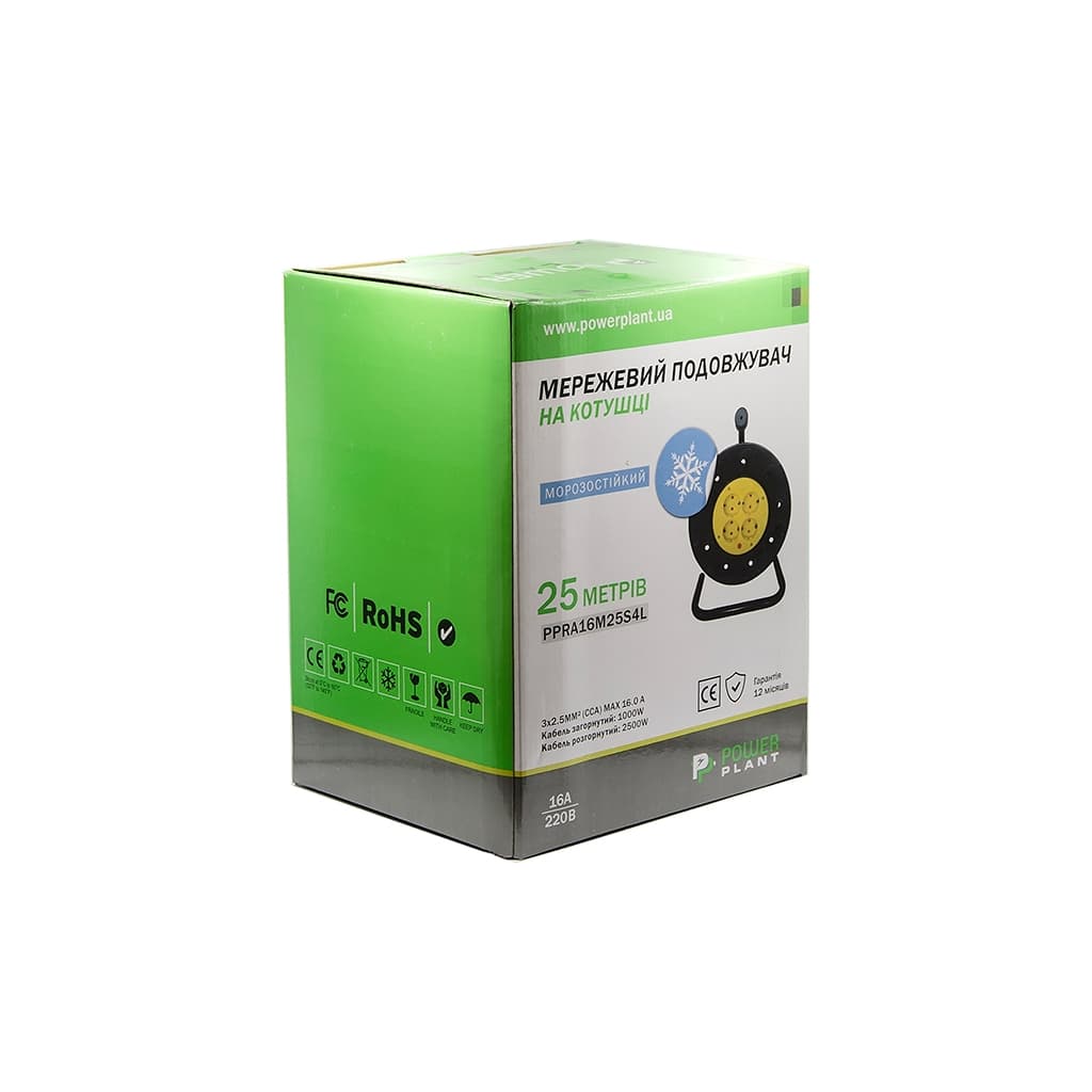 Мережевий подовжувач PowerPlant катушка 25 м, 3x2.5мм2, 16А, 4 розетки (PPRA16M25S4L)