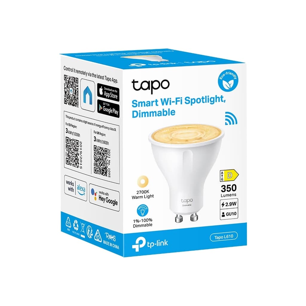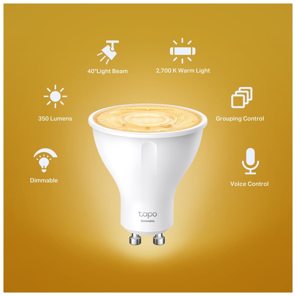 тип цоколя - GU10, форм-фактор - гриб, Потужність - 2.9 Вт, 350 Лм, Колір світіння - теплий, колірна температура - 2700 К, Бездротовий інтерфейс - Wi-Fi, Сумісні ОС - Android, iOS, Особливості - регулювання яскравості, діммірування, голосове управління, віддалене управління