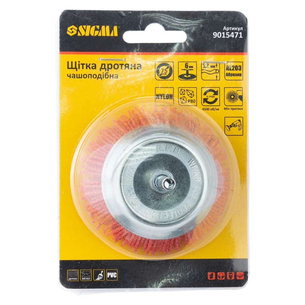 Щітка для електроінструменту Sigma дротяна чашеподібна 75мм хвостовик O6мм нейлонова 9015471 (9015471)