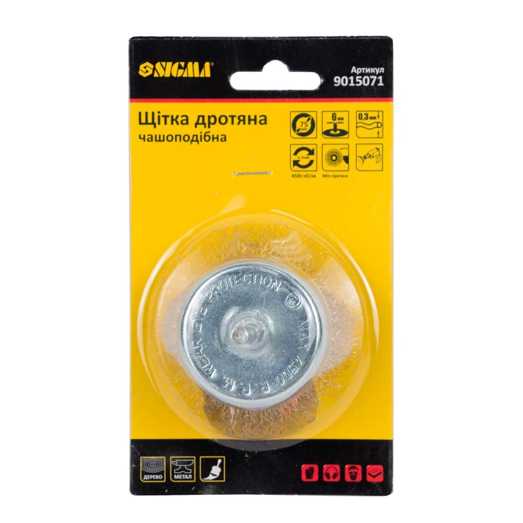 Щітка для електроінструменту Sigma дротяна чашоподібна 75мм хвостовик O6мм латунированная 9015071 (9015071)