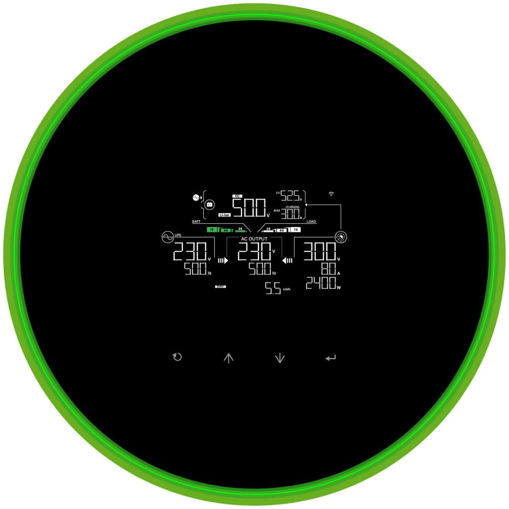 гібридний, 1 фаза, Потужність інвертора (активна) - 5.6 кВт, 90 - 280 В, 5.6 кВ·А, 120 А, 5-95% відносної вологості (без конденсації), вентилятор, 468 х 295 х 140 мм