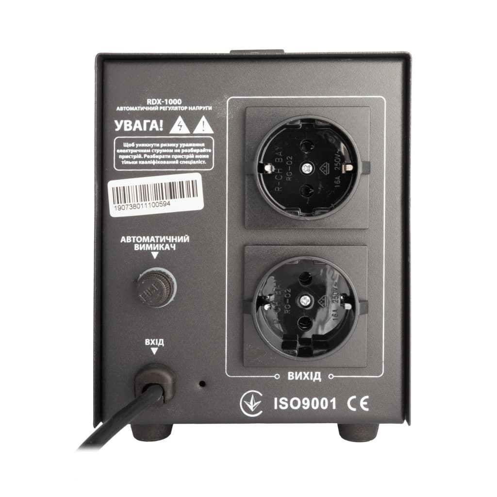 Спосіб установки - підлоговий, потужність, Вт - 700 Вт, потужність, ВА - 1000 VA, мінімальна вхідна напруга, В - 140V, максимальна вхідна напруга, В - 260 В, точність стабілізації - ± 10 %, підключення до мережі 220В - вилка, кількість розеток - 2, відображення значень вхідного/вихідного напруг - світлодіод