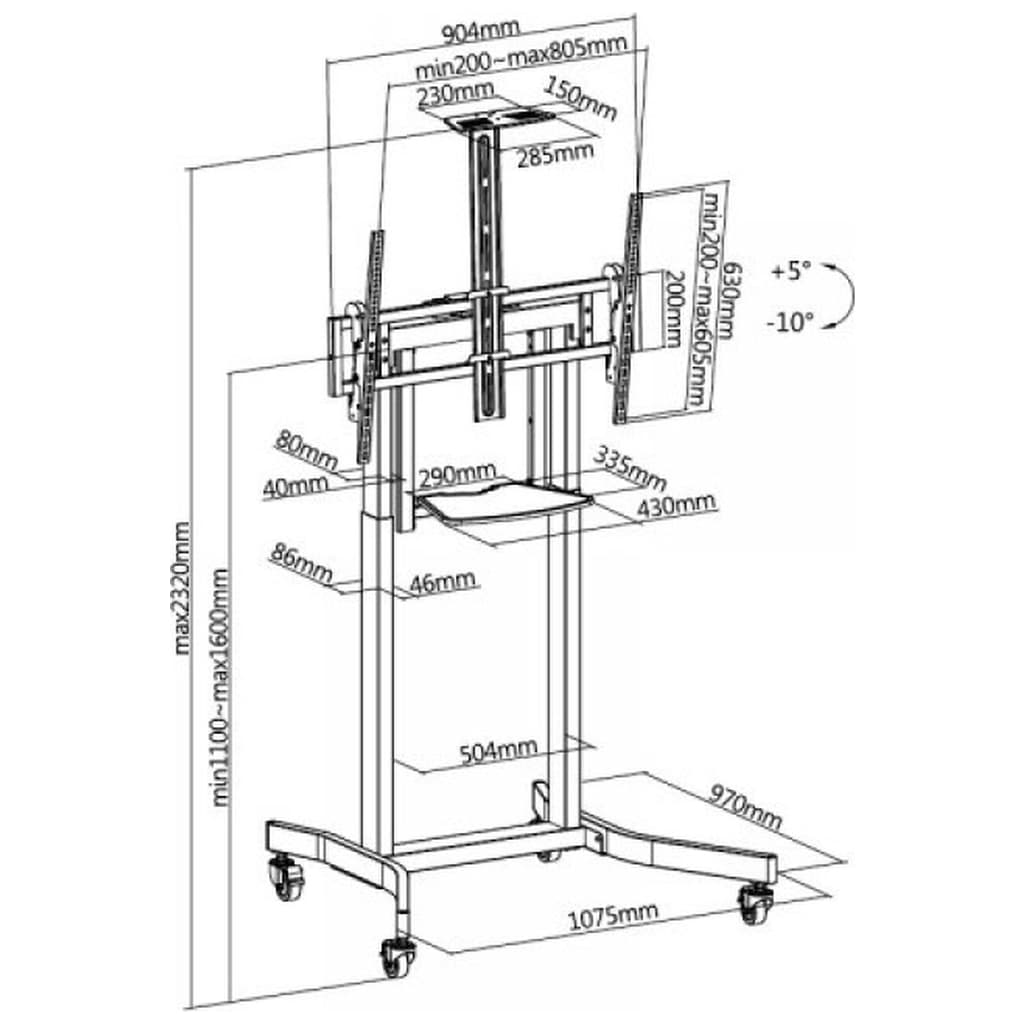 200 x 200, 300 x 200, 300 x 300, 350 x 350, 400 x 200, 400 x 300, 400 x 400, 600 x 200, мінімальна підтримувана діагональ - 55", максимальна підтримувана діагональ - 100", Регулювання - за висотою, Кут нахилу - 5° ~ -10°, Вага - 43.8 кг, чорний