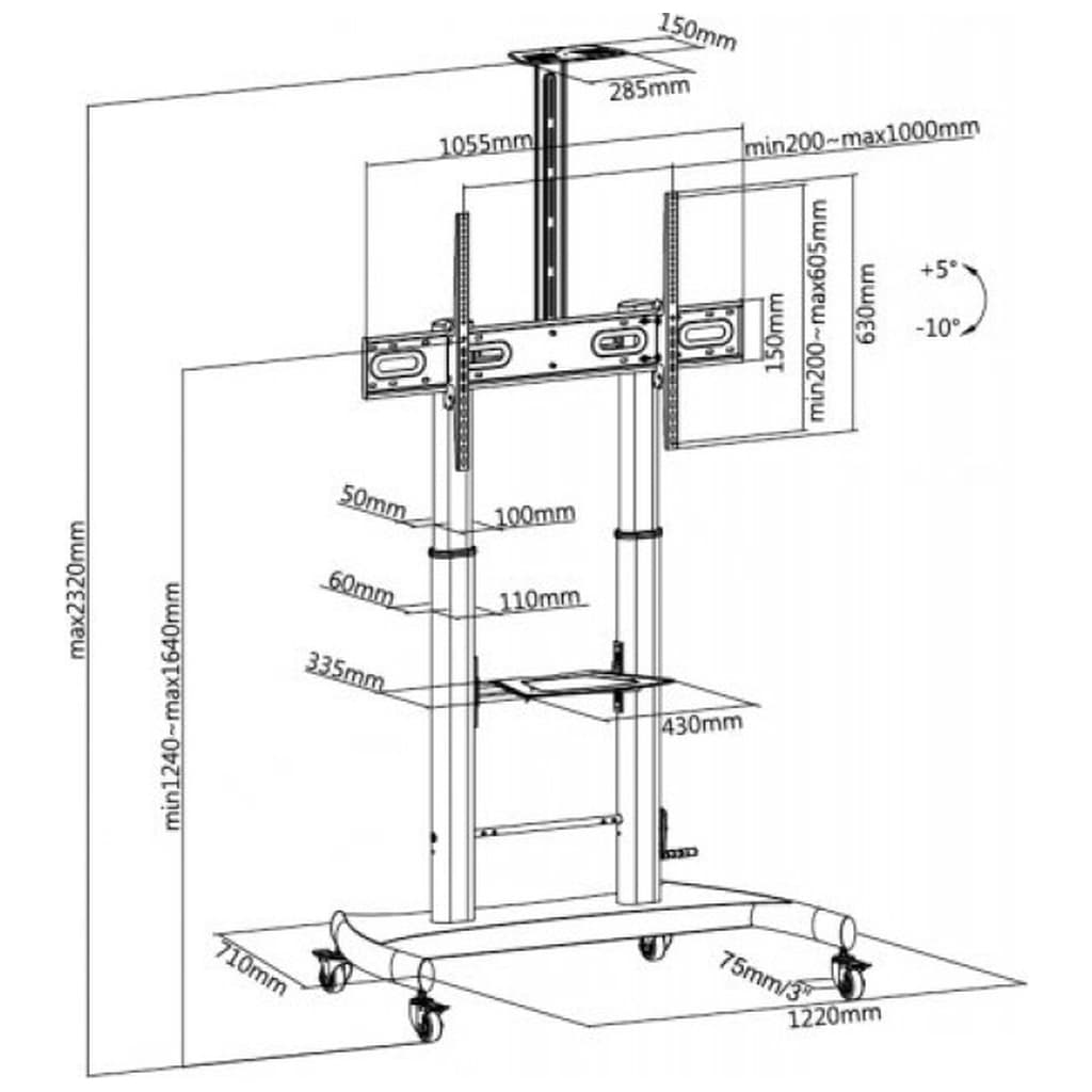 400 x 400, 600 x 400, 800 x 400, 800 x 600, 900 x 600, 1000 x 600, мінімальна підтримувана діагональ - 60", максимальна підтримувана діагональ - 100", Регулювання - за висотою, Кут нахилу - 5° ~ -10°, Вага - 26.2 кг, чорний