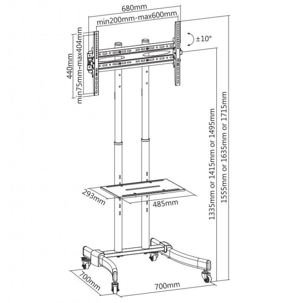 200 x 200, 300 x 300, 400 x 200, 400 x 400, 600 x 400, мінімальна підтримувана діагональ - 37", максимальна підтримувана діагональ - 70", Регулювання - нахил, Кут нахилу - 10° ~ -10°, Кількість ступенів свободи - 1, чорний