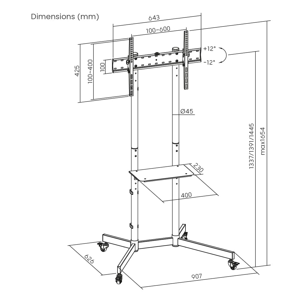 100 x 100, 200 x 200, 300 x 200, 300 x 300, 400 x 200, 400 x 300, 400 x 400, 600 x 400, мінімальна підтримувана діагональ - 37", максимальна підтримувана діагональ - 70", Регулювання - за висотою-нахилом, Кут нахилу - +12° ~ -12°, Кількість ступенів свободи - 2, чорний