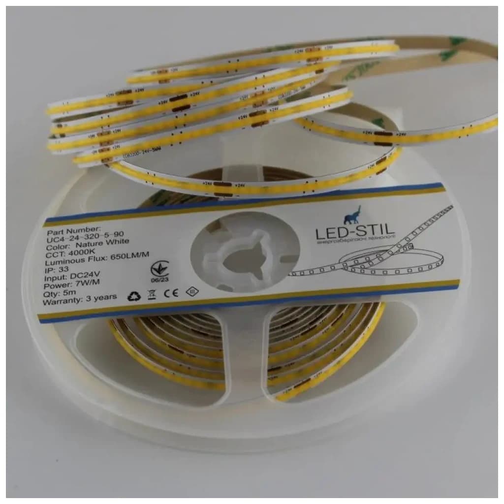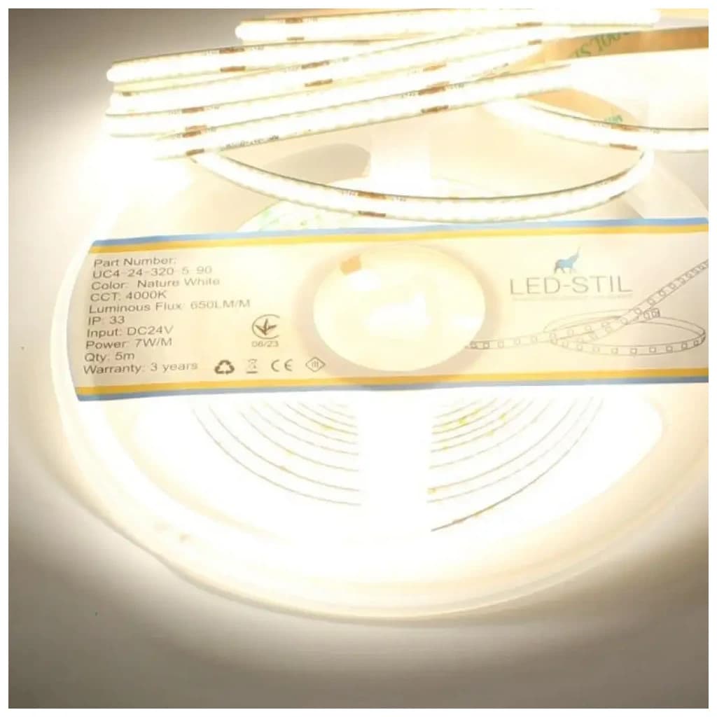 Світлодіодна стрічка LED-STIL 4000K 7 Вт/м COB 320 діодів IP33 24 Вольта 650 lm нейтральне світло, вузька (UC4-24-320-5-90)