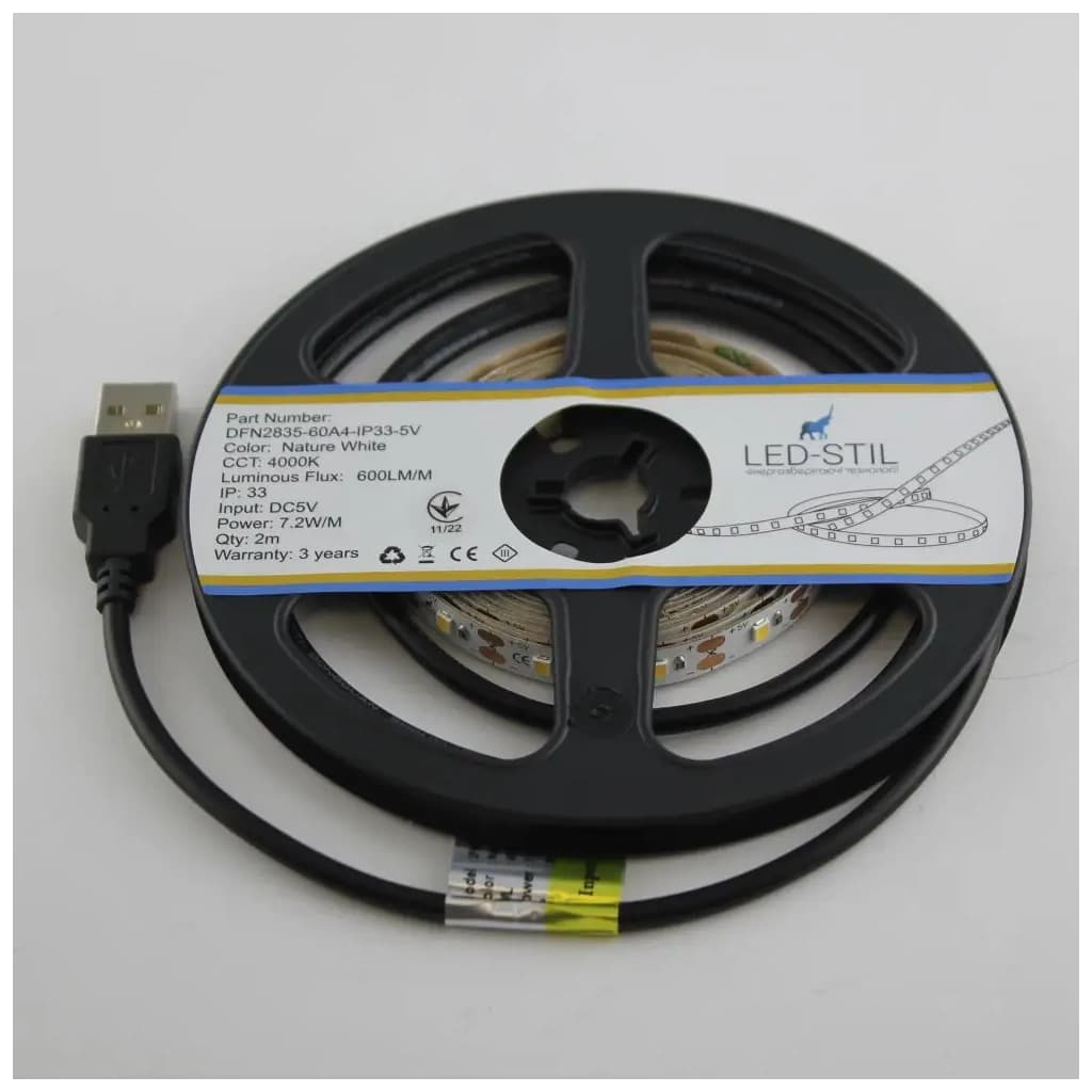 побутова, 7.2 Вт/м, Світловий потік - 700 лм, 4000 K, білий, 60 шт/м, SMD 2835, Ресурс роботи - 30 000 г, -20 - 50 °C, IP33, 5 В, USB, 2 м, 8 мм