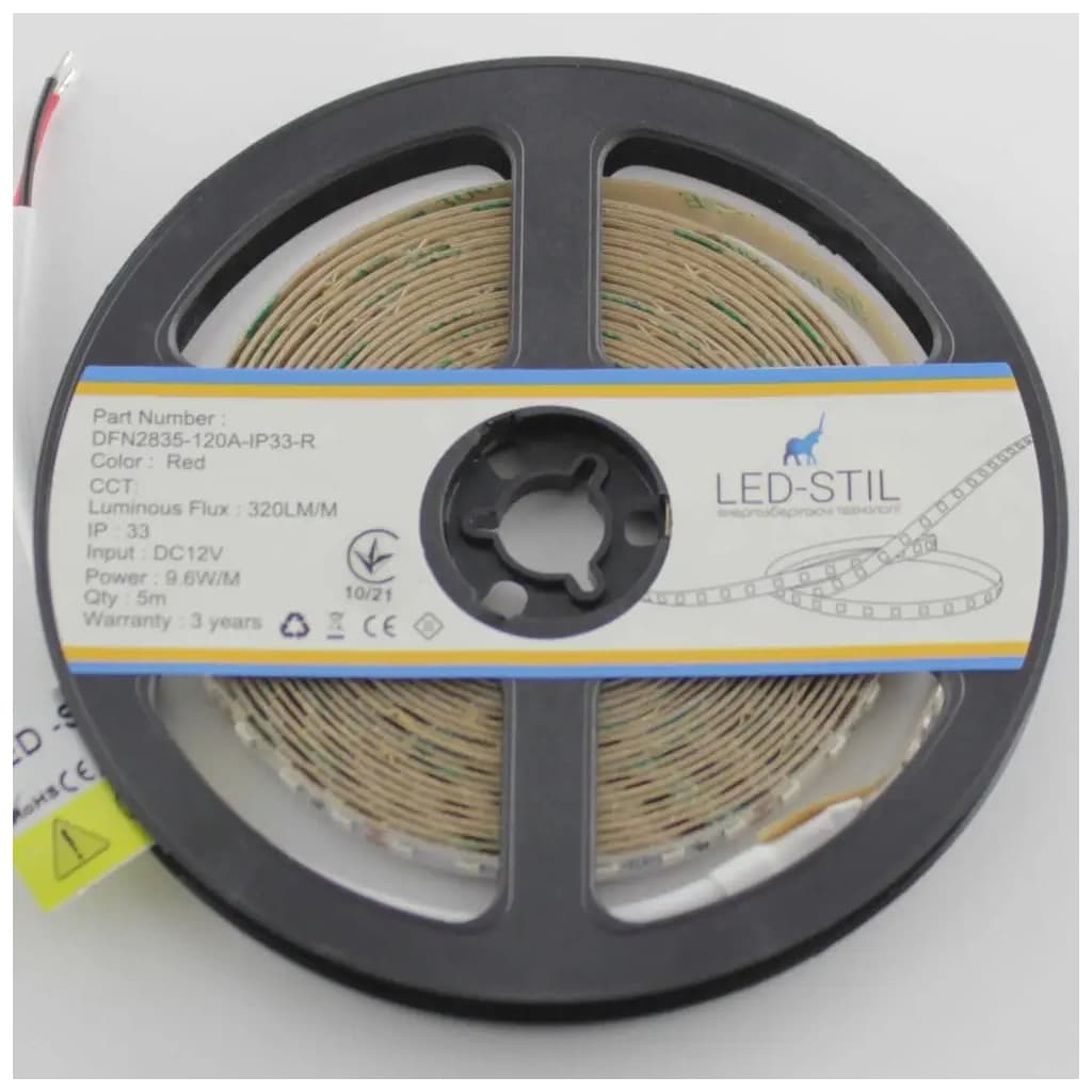 побутова, 9.6 Вт/м, Світловий потік - 100 лм, 2700 K, червоний, 120 шт, SMD 2835, Ресурс роботи - 30 000 г, -20 - 50 °C, IP33, 12 В, від мережі, 5 м, 8 мм