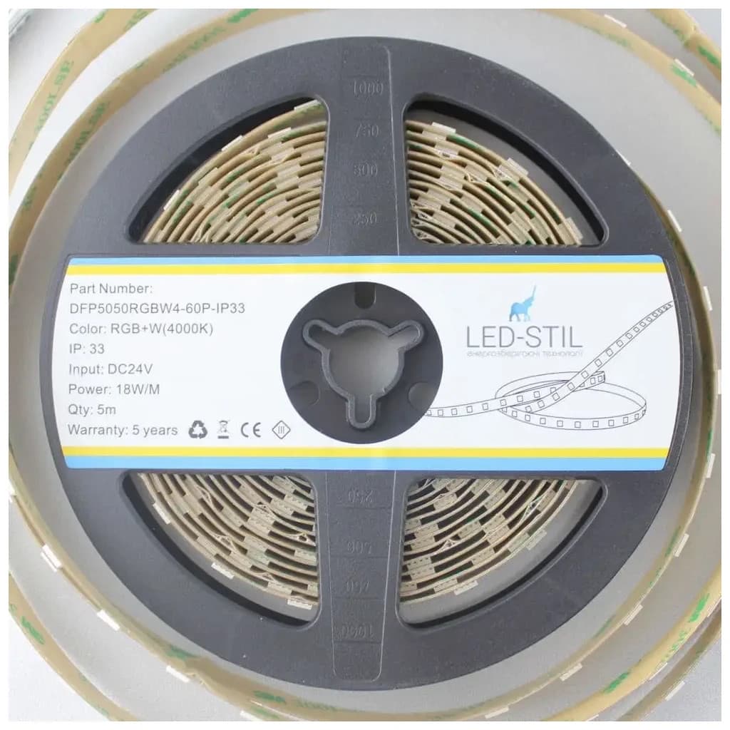 Світлодіодна стрічка LED-STIL RGB+W 4000К 18 Вт/м 5050 60 діодів IP33 24 Вольта 180 lm кольорова (DFP5050RGBW4-60P-IP33-24V)