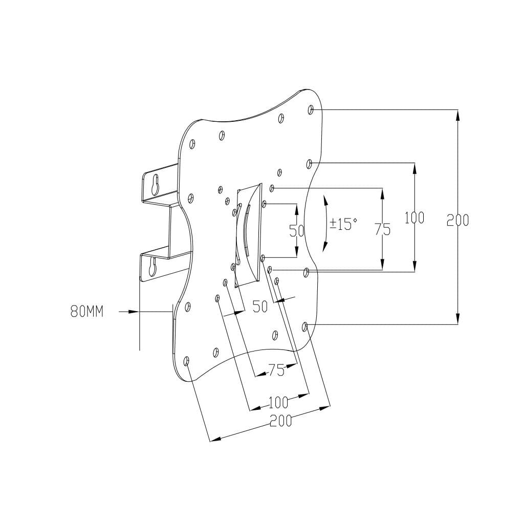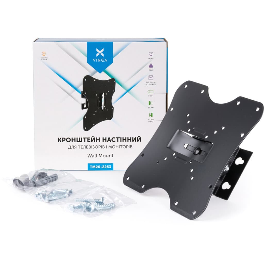 для монітора, для телевізора, Тип - похилий, кількість ступенів свободи - 1, мінімальна підтримувана діагональ - 14", максимальна підтримувана діагональ - 42", VESA - 50 x 50, 75 x 75, 100 x 75, 100 x 100, 150 x 100, 200 x 100, 200 x 200, Максимальне навантаження - 25 кг, Нахил - 15°, відстань до стіни - 95 мм, інструкція, елементи кріплення, чорний