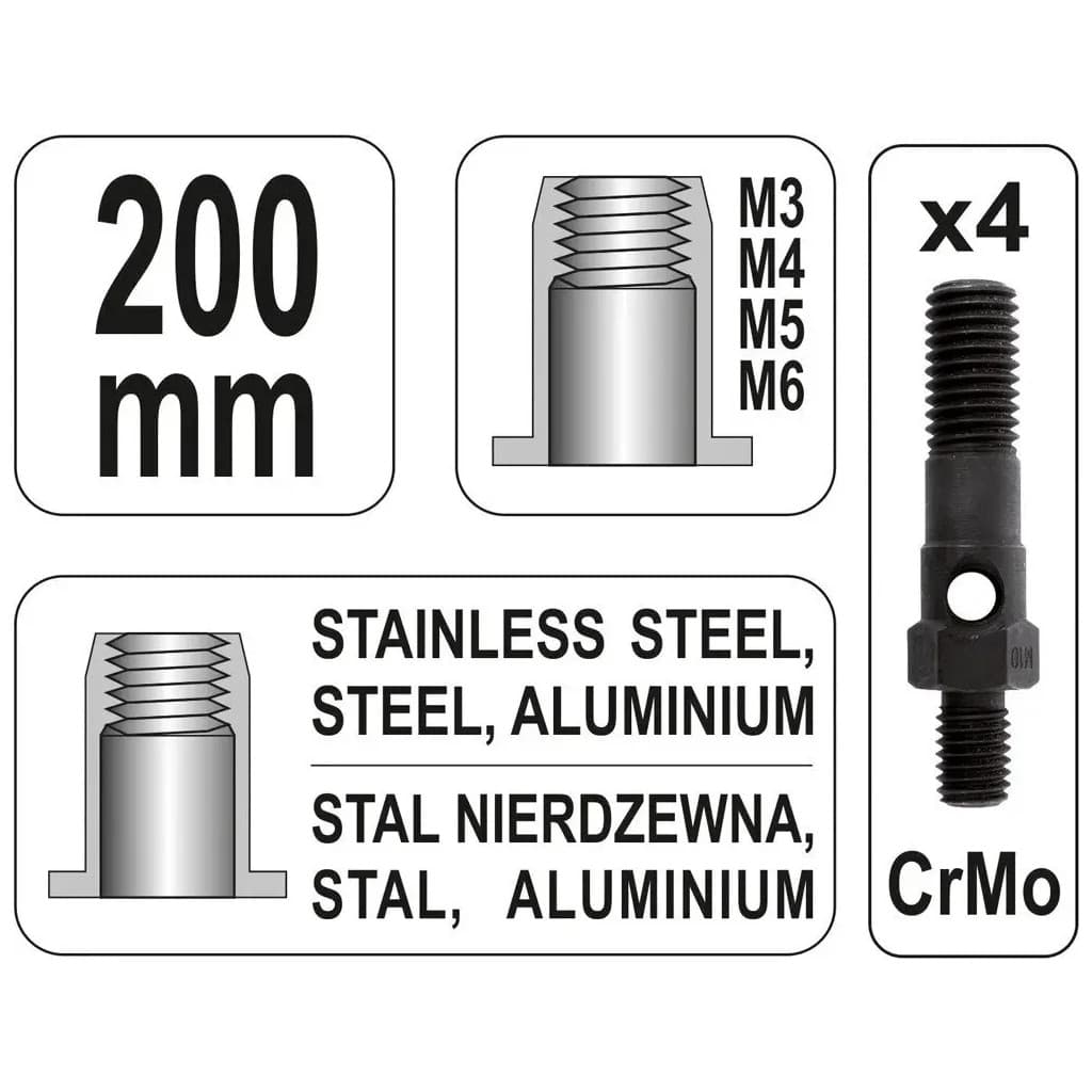 Тип - ручний, матеріали заклепок - алюміній, нержавіюча сталь, сталь, діаметр заклепок, мм - M3, M4, M5, M6, тип заклепок - різьбовій