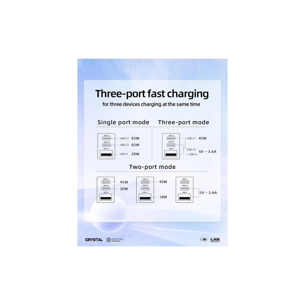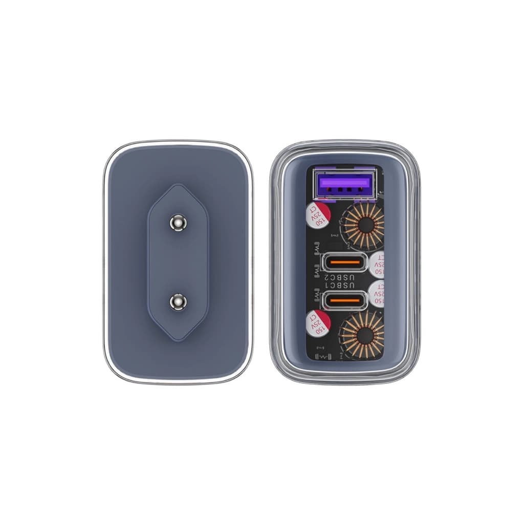 Тип - адаптер, Живлення - мережа, Призначення - для планшета, для фітнес-браслета, для геймпада, для екшн-камер, для смарт годинника, для ноутбука, для телефону, тип вихідного підключення - USB Type-C, USB, Max - 3.6 А, 65 Вт, кількість USB портів - 1 x USB, 2 x USB Type C, швидка зарядка - Quick Charge, Power Delivery, сірий