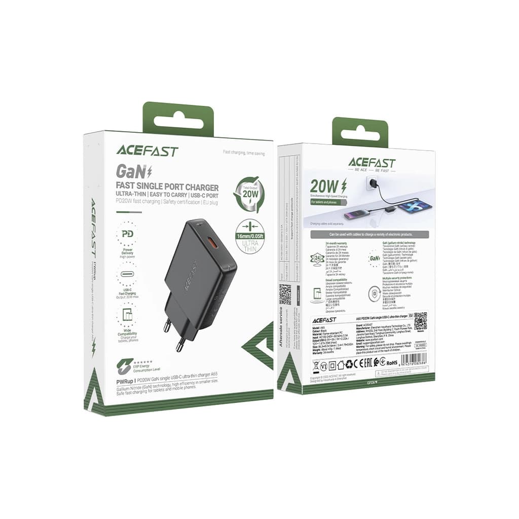 Зарядний пристрій Acefast A65 USB-C PD20W GaN ultra-thin Black (6974316282686) | General Security