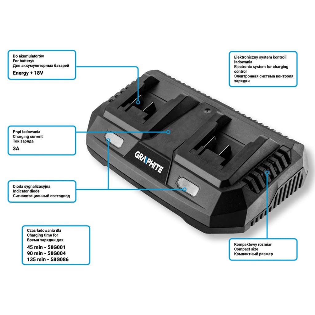Зарядний пристрій для акумуляторів інструменту Graphite Energy+ 18V, 3А,0.74кг (58G085)