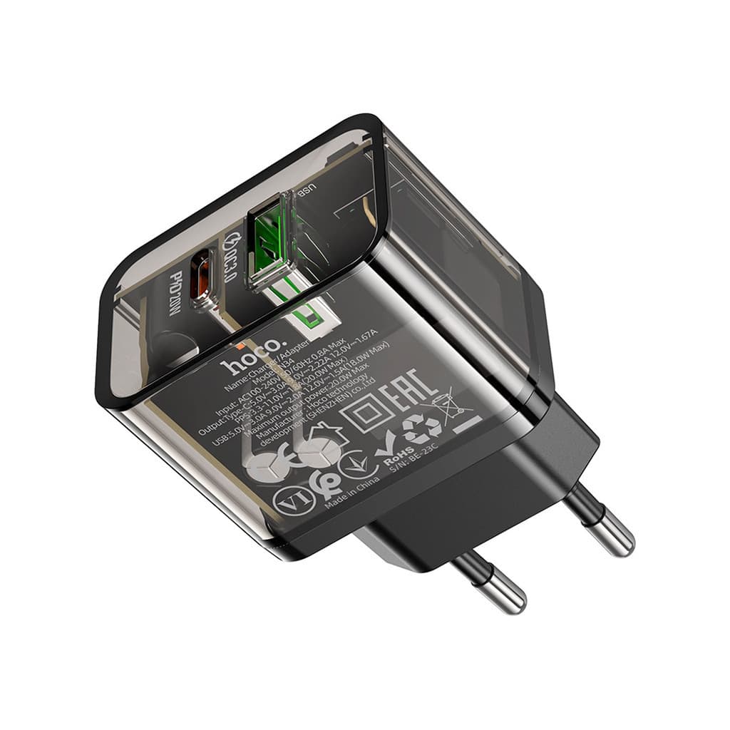 Тип - адаптер, Живлення - мережа, Призначення - універсальне, для телефону, тип вихідного підключення - USB Type-C, USB, Max - 3 А, 20 Вт, кількість USB портів - 1 x USB, 1 x USB Type C, швидка зарядка - Power Delivery, Quick Charge 3.0, чорний
