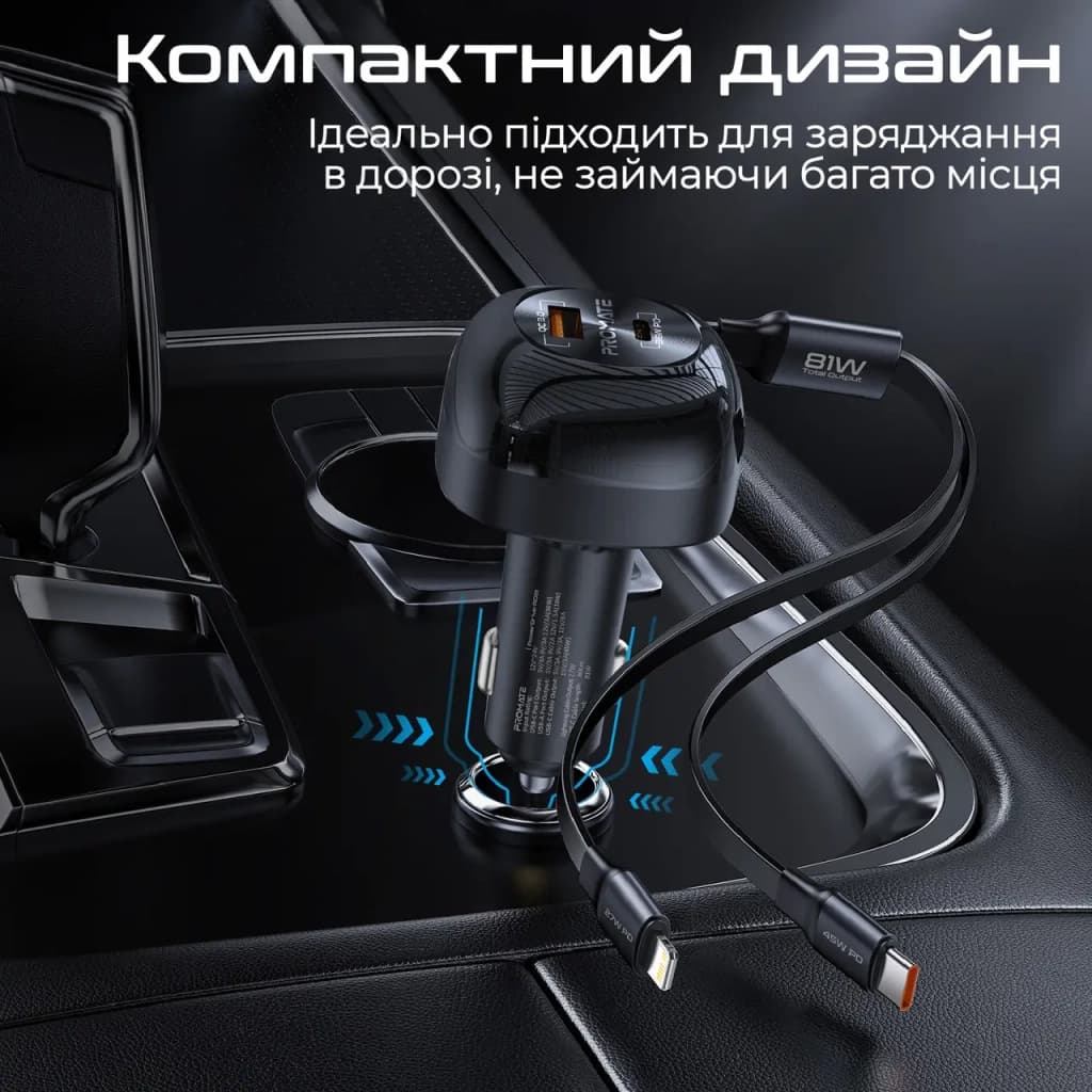 Зарядний пристрій Promate 1xUSB-C PD + 1xUSB + cable USB-C/Lightning max 81W black (powerdrive-rci81)