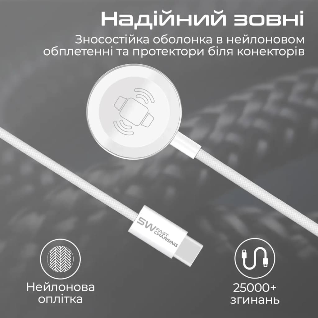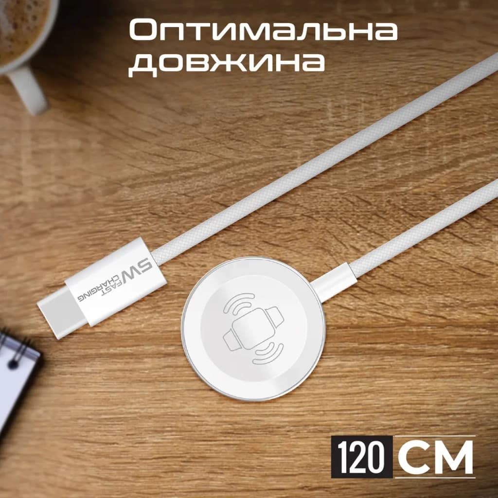 Тип - адаптер, Живлення - USB Type-C, Призначення - для смарт годинника, тип вихідного підключення - MagSafe, Max - 1 A, 5 Вт, швидка зарядка - Fast Charging, довжина кабеля - 1.2 м, білий