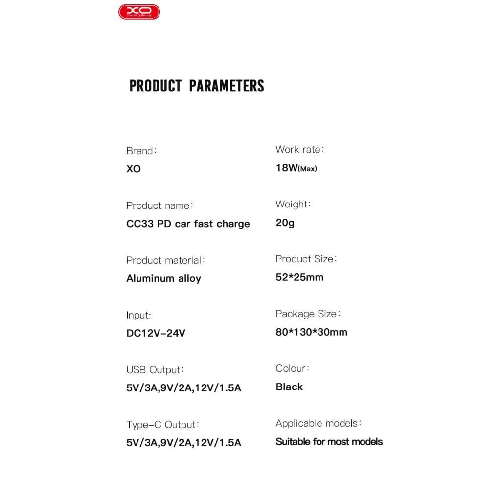 Зарядний пристрій XO 1xUSB QC3.0 + 1xUSB-C PD18W black (CC33-BK)