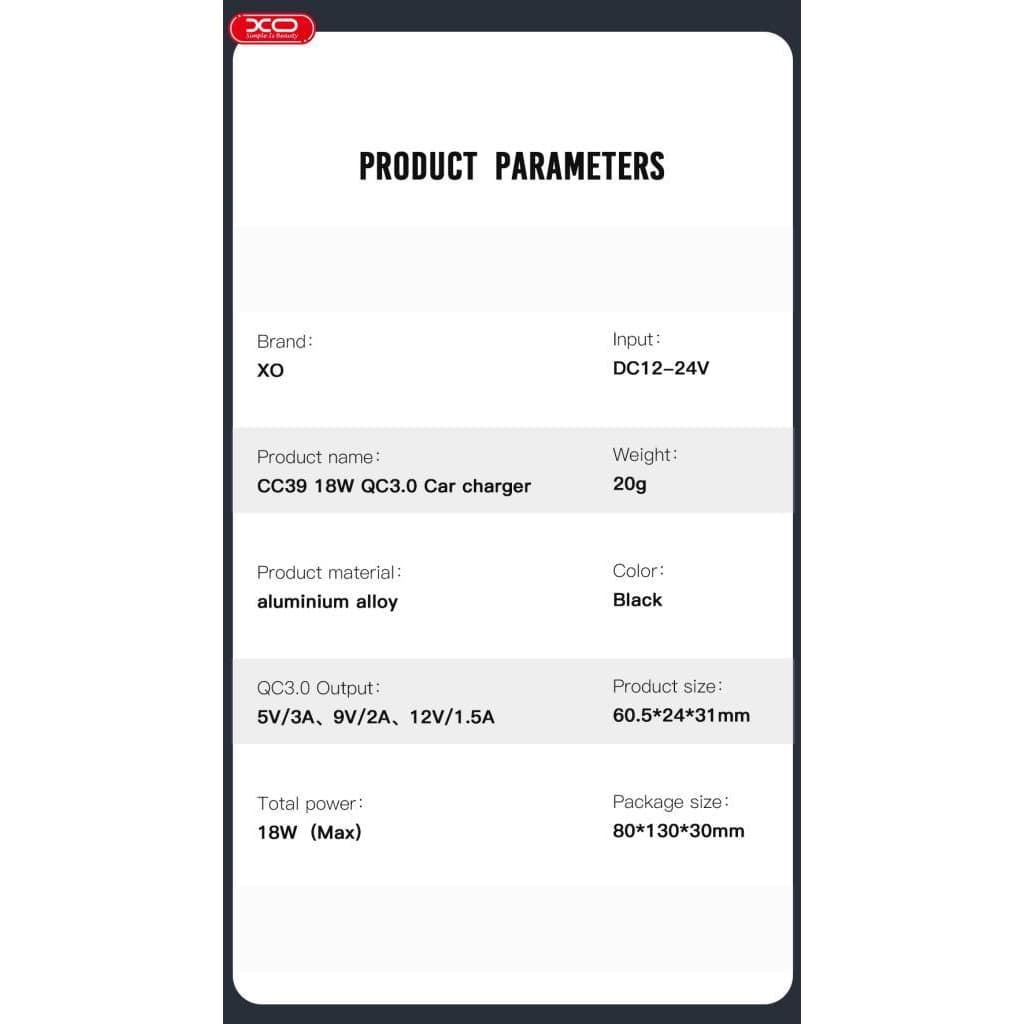 Зарядний пристрій XO USB QC3.0 black (CC39-BK)