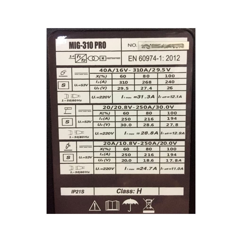 напівавтомат, 220 В, 6.4 кВт, 310 А, Діаметр зварювального електроду - 1.6-5 мм, Товщина дроту - 0.6-1.0 мм, IP21, Клас ізоляції - H, 500 х 320 х 230 мм, 15 кг